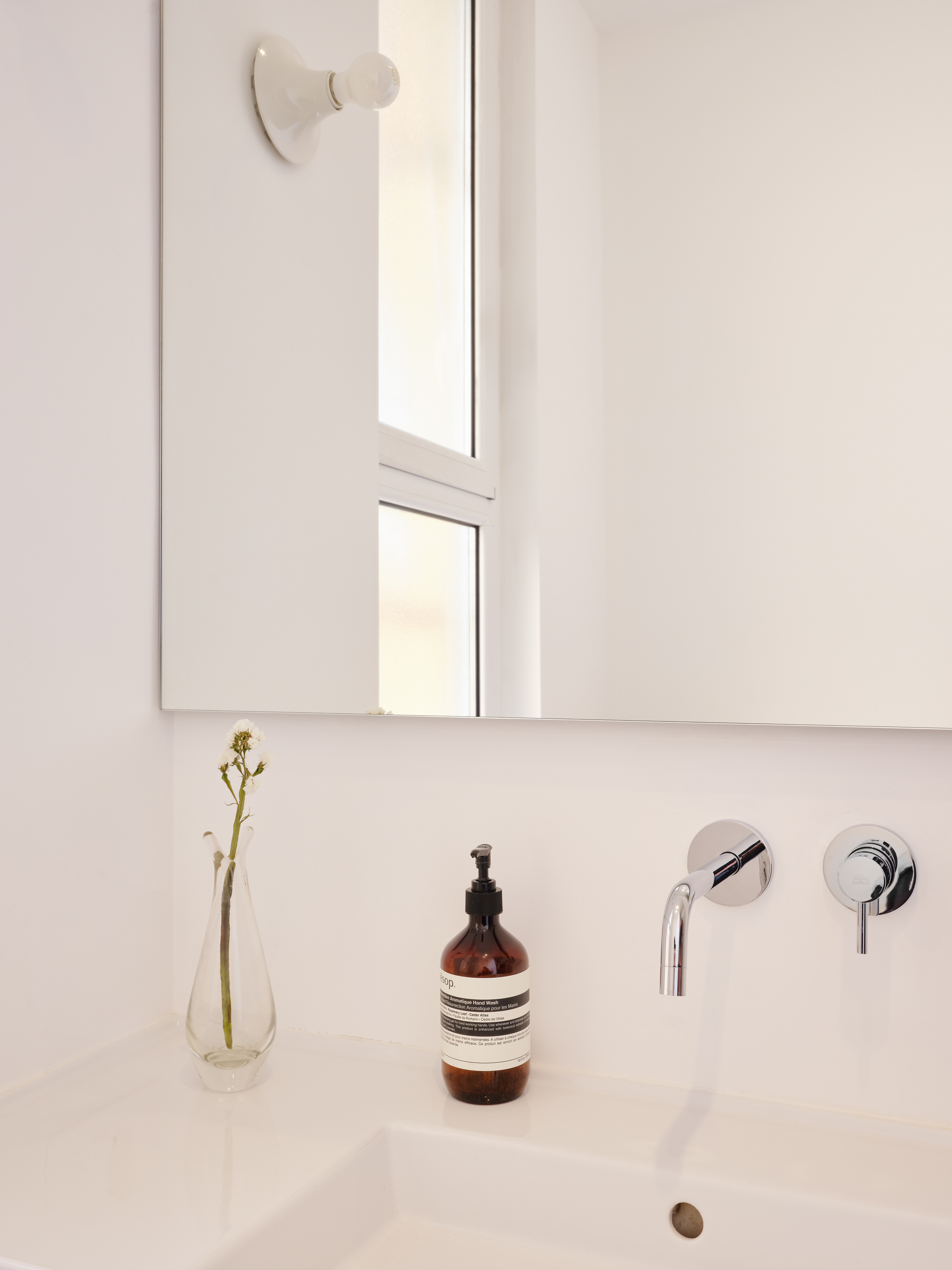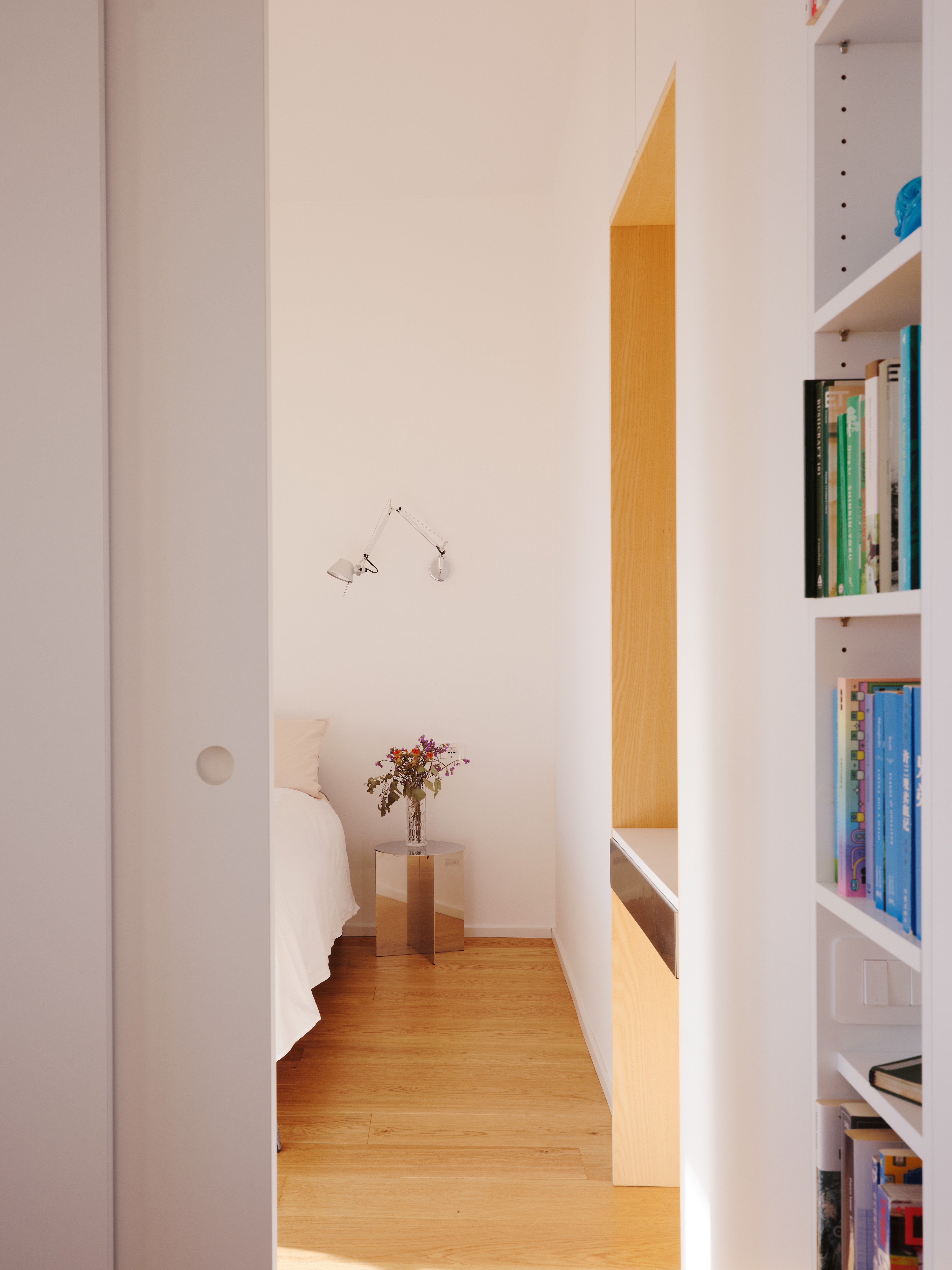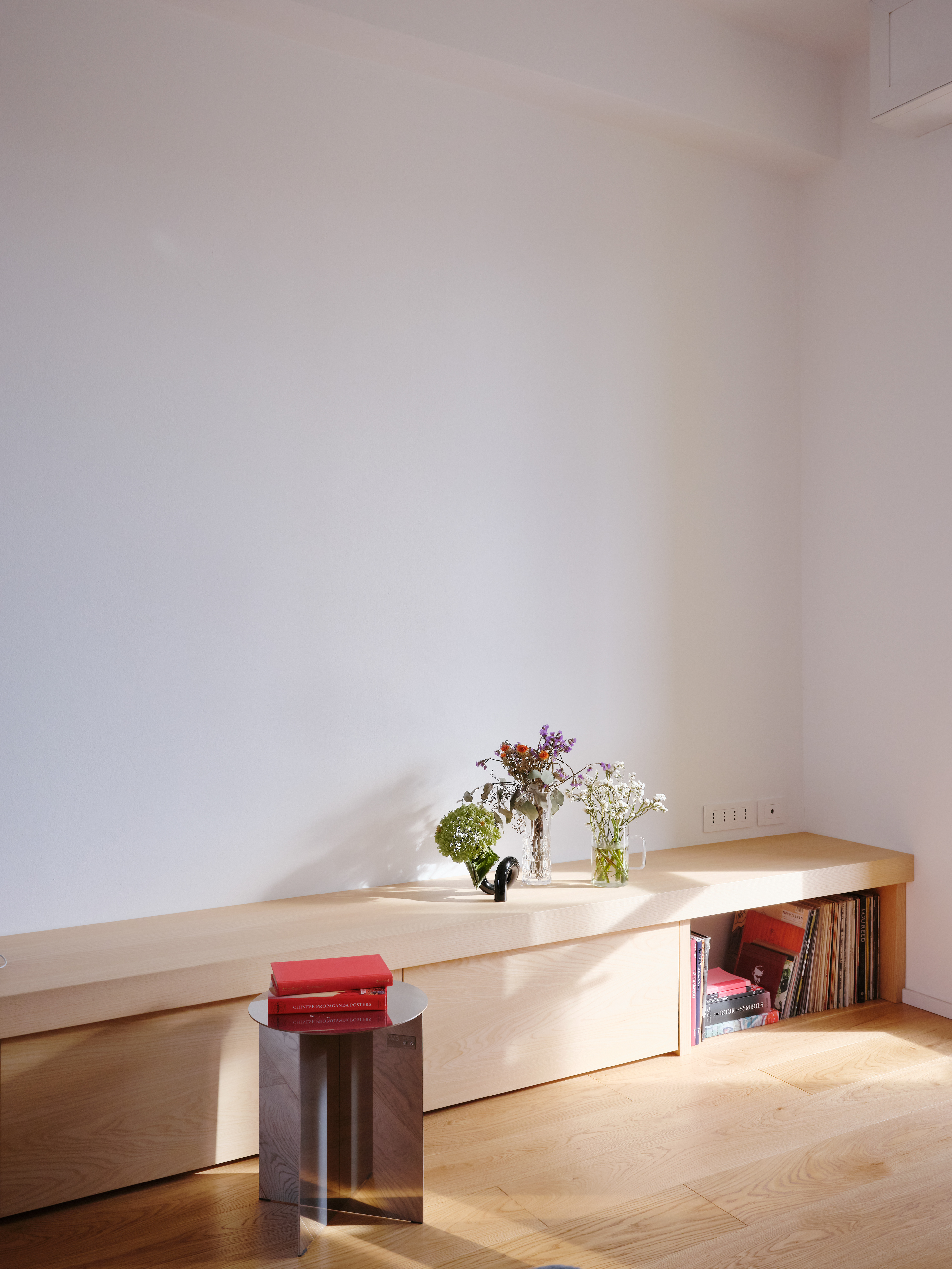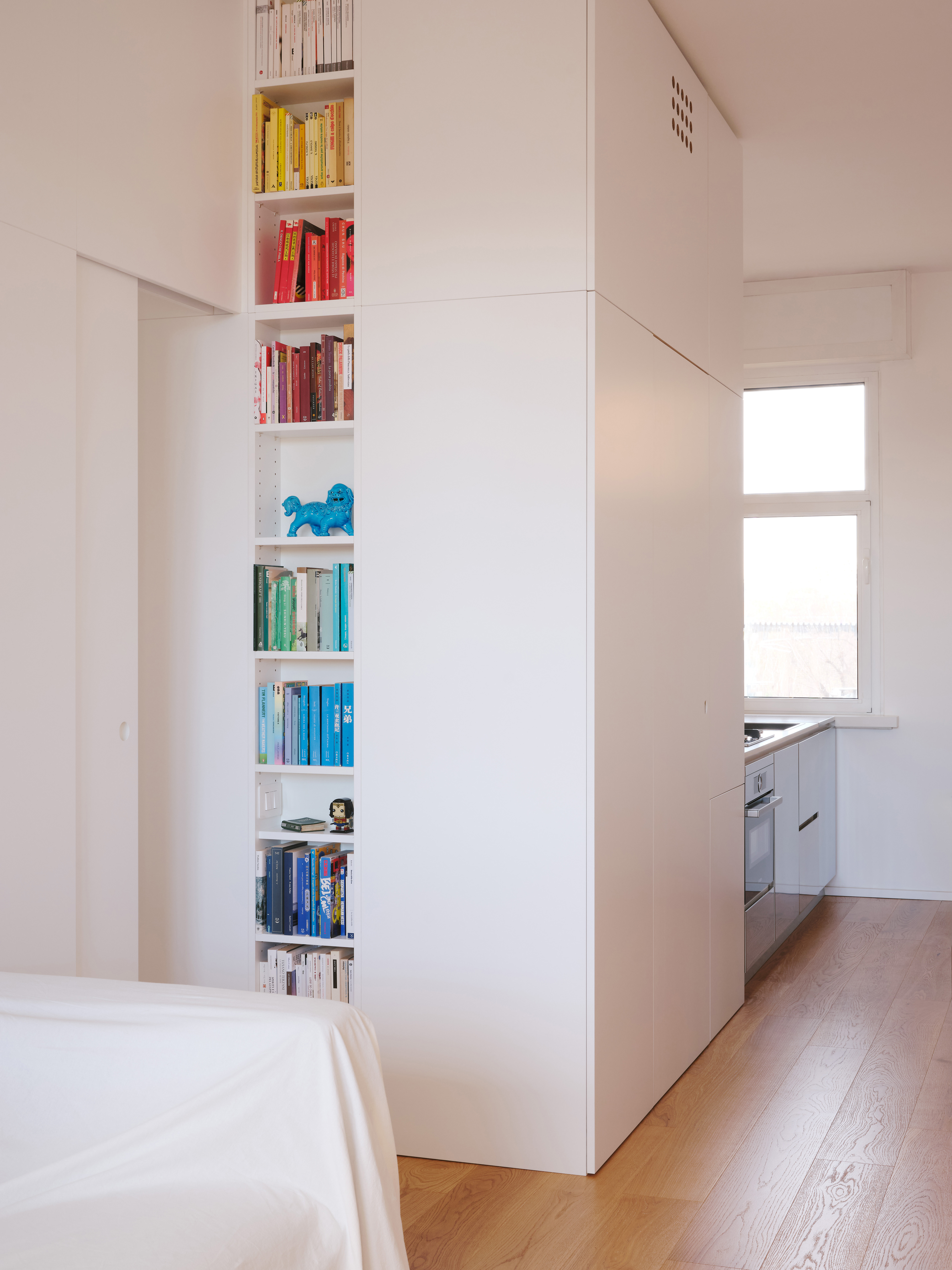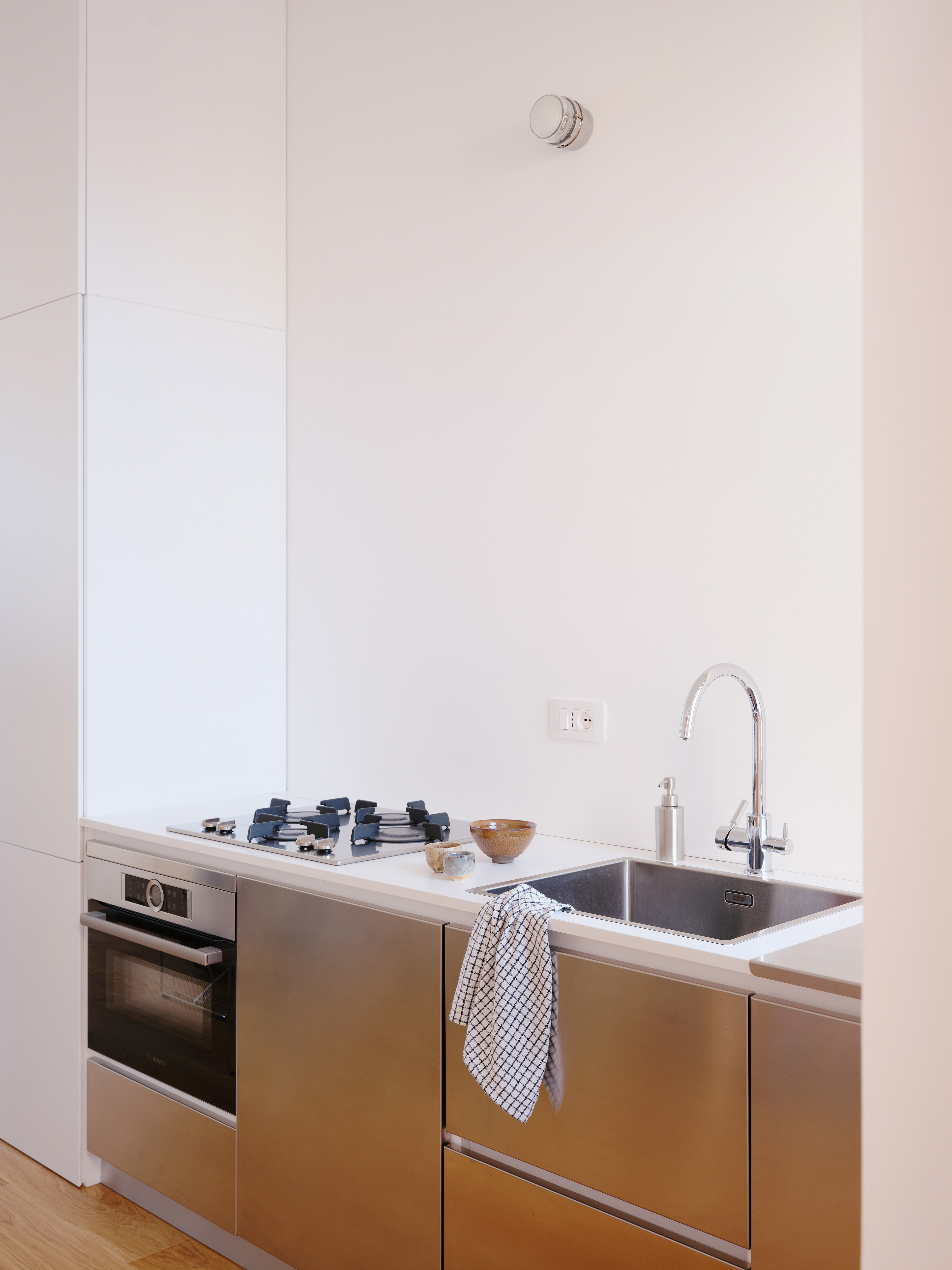 The original walls were completely removed, and custom-made furnishings – crafted in Ash and white Fenix panels – subtly define the different areas. The stainless steel kitchen, set within a linear volume, dialogues with the continuity of surfaces and the warmth of natural oak flooring. Chosen for its durability and resilience, stainless steel introduces a technical and industrial note that harmonizes with the neutrality of the white surfaces and the warmth of the light wood.