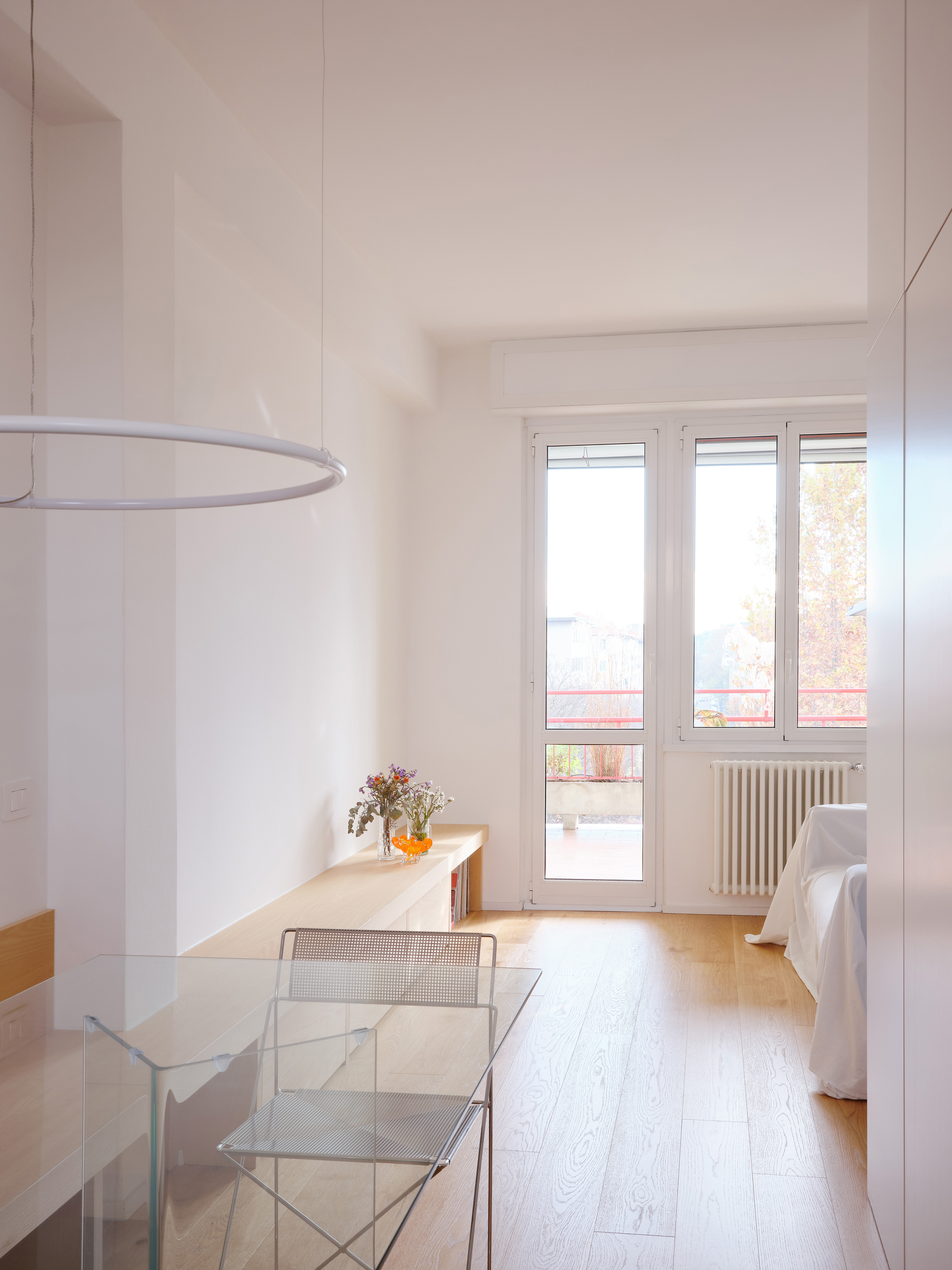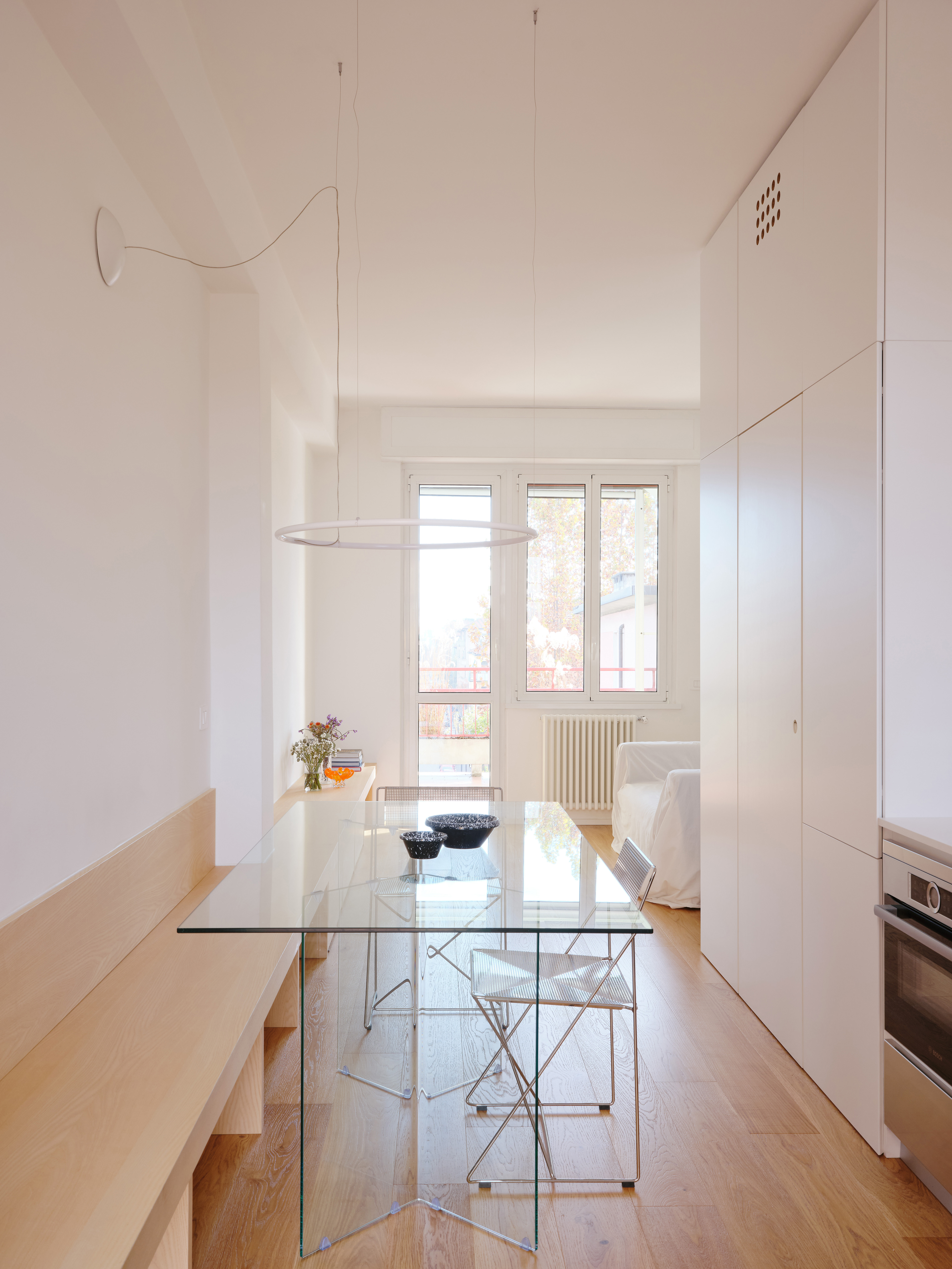 Full-height white volumes house storage units, helping to create a tidy and uncluttered environment. Furniture pieces, light and almost transparent, such as the glass dining table and metal chairs, minimize visual impact and reinforce spatial continuity. Discreet and minimalist lighting runs along the apartment’s longitudinal axis, without interrupting the formal clarity of the design. Natural light, pouring through the large windows overlooking the exterior, permeates the entire space, becoming an integral part of the project and enhancing the sense of openness and depth.